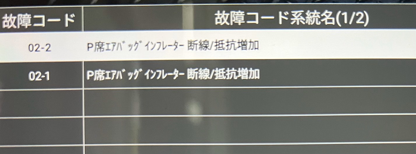 診断機で故障コードを確認したところ、助手席側エアバックインフレーターが断線/抵抗増加とありました。