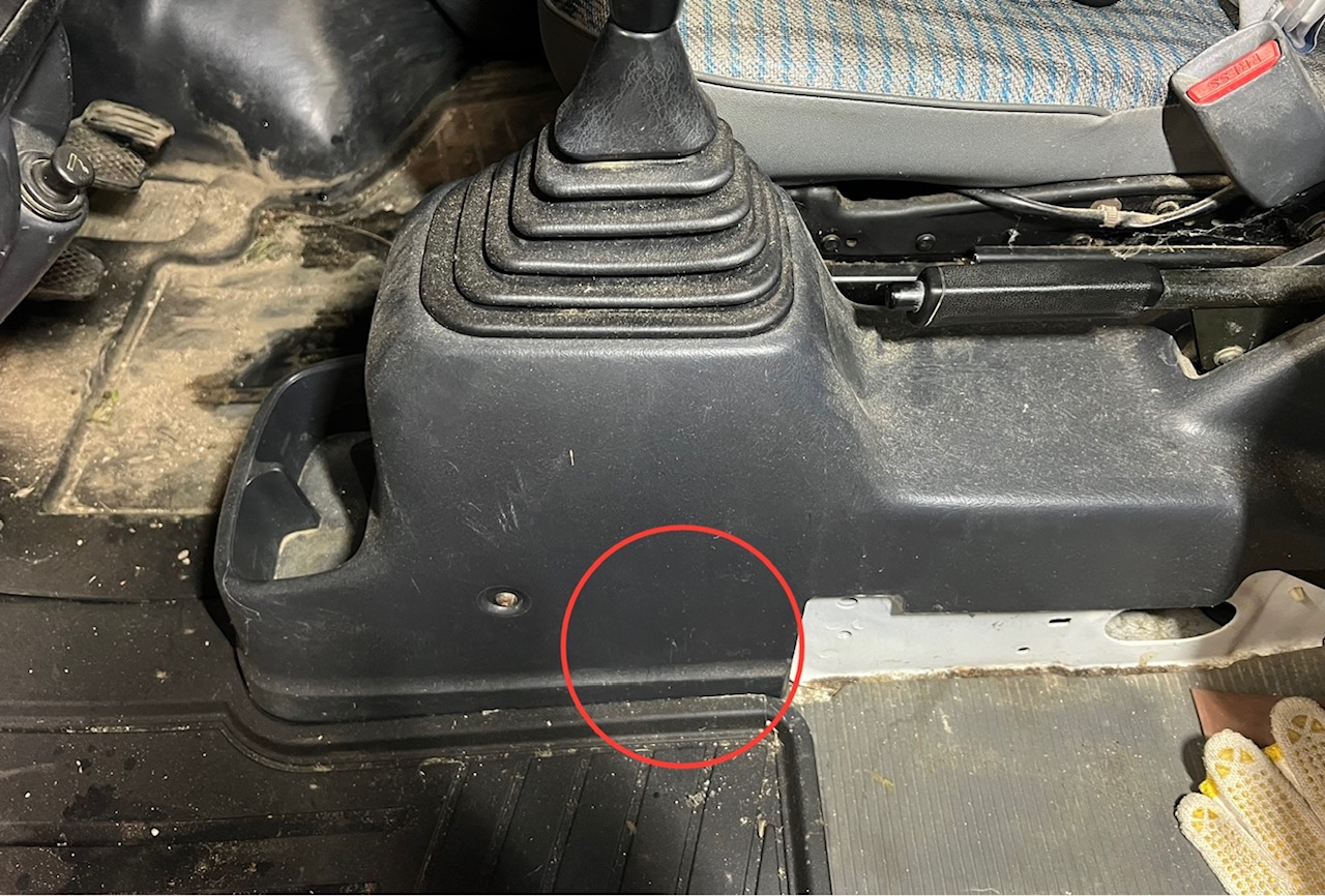 そのコネクタの場所は助手席側から見て、シフトノブ下部付近のパネル赤丸内部にあります。