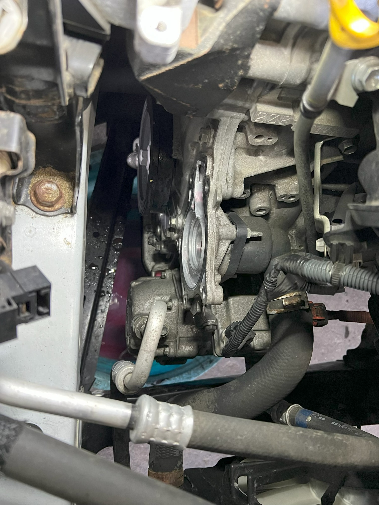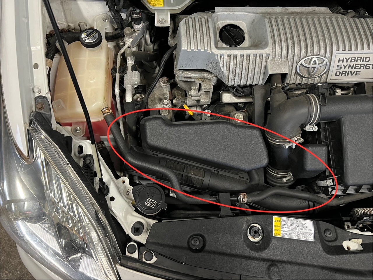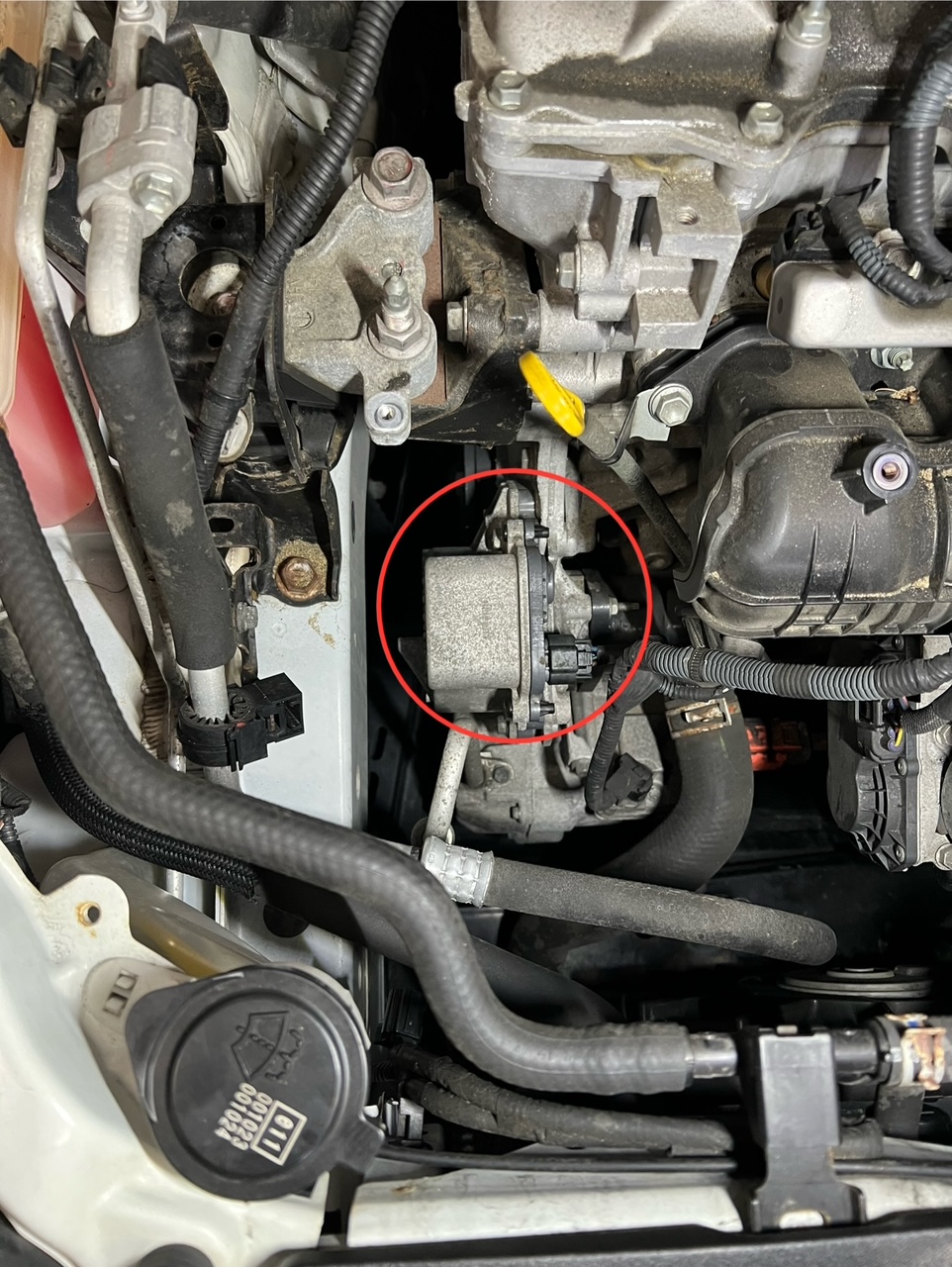 ウォーターポンプは写真赤丸の部品、エアクリーナーインレットASSYを取り外すとその下にウォーターポンプが見えます。